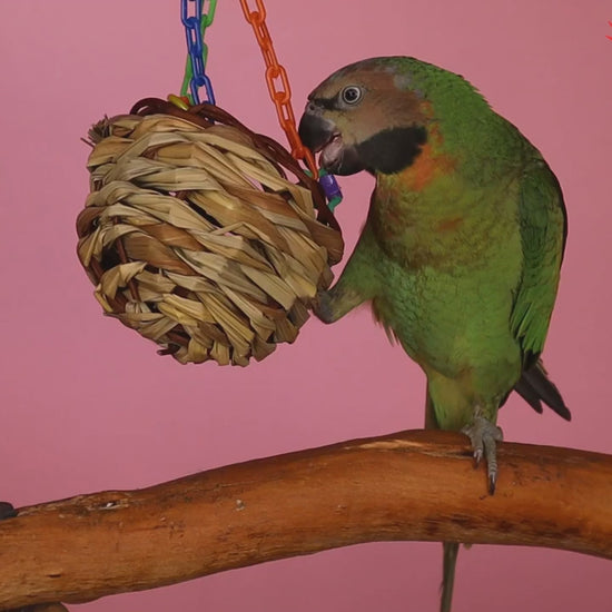 The hanging treat basket is a wonderful addition to your fid's toy chest. Add in your parrot's favorite treats, chop, or foot toys for fun foraging opportunities! A chewing parrot will make quick work of the woven seagrass basket, but the more meticulous of our beloved feathered friends will love exploring the hanging treat basket again and again!