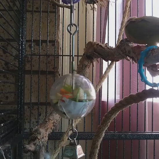 Isi dengan hidangan, pelet dan buah-buahan. Haiwan peliharaan anda akan mendapatkannya daripada 1 daripada 5 slot (0.375" x 1.25"). Bebola plastik polikarbonat impak tinggi yang jelas adalah 3" diameter. Kedua-dua bahagian terletak dengan selamat pada lidi apabila diskrukan ke dalam tapak. Hanya tanggalkan skru dari tapak untuk mengeluarkan bahagian atas untuk mengisi semula. Mempunyai lima slot 3/8" x 1 1/4" melalui mana burung anda boleh mendapatkan semula item di dalamnya.