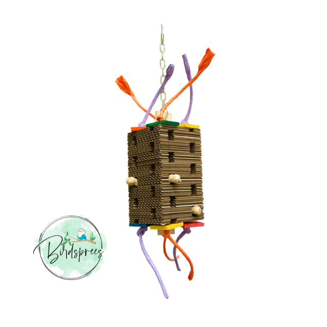 Kraft paper board is held together with colorful wooden slats and kraft paper rope in a structure that can hold all sorts of foraging bounty for your curious bird!