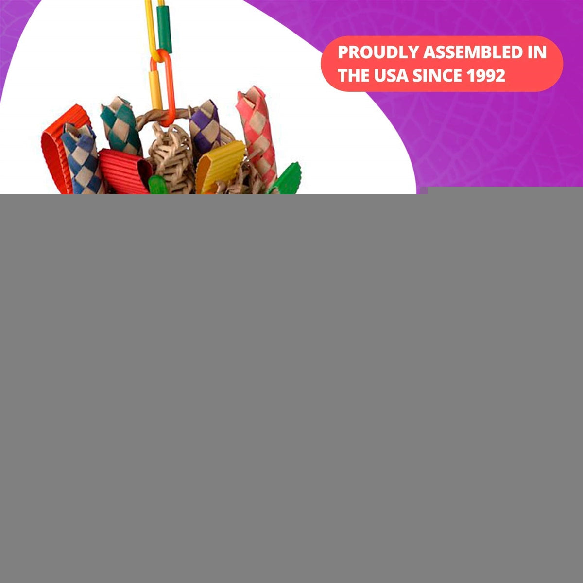 Shreddable materials including wooden popsicle sticks, spoons, woven grass mat & spiral roll, mini loofahs, plastic coils. Sturdy wicker basket filled with a huge variety of shredable materials, including wooden popsicle sticks, ice cream spoons, woven grass mat & spiral roll, mini loofahs, paper fingers, corrugated paper, plastic coils & a variety of colorful beads and rings.