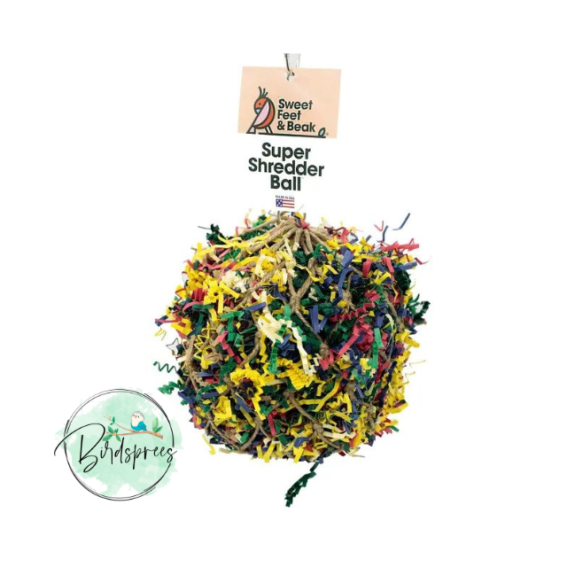 The famous and award winning Super Shredder Ball™ only from SF&B is what shredding fun is all about! Famous? Really? Yeah, it was featured on ABC’s Good Morning America segment “The Pet Doctor with Marty Becker.” National TV, not bad! Anyway, the Super Shredder Ball™ is stuffed full of colorful shredded paper and food colored dyed wooden prizes to discover. This will keep your bird busy for weeks foraging for the hidden treasures inside. Now all sizes made in the USA!