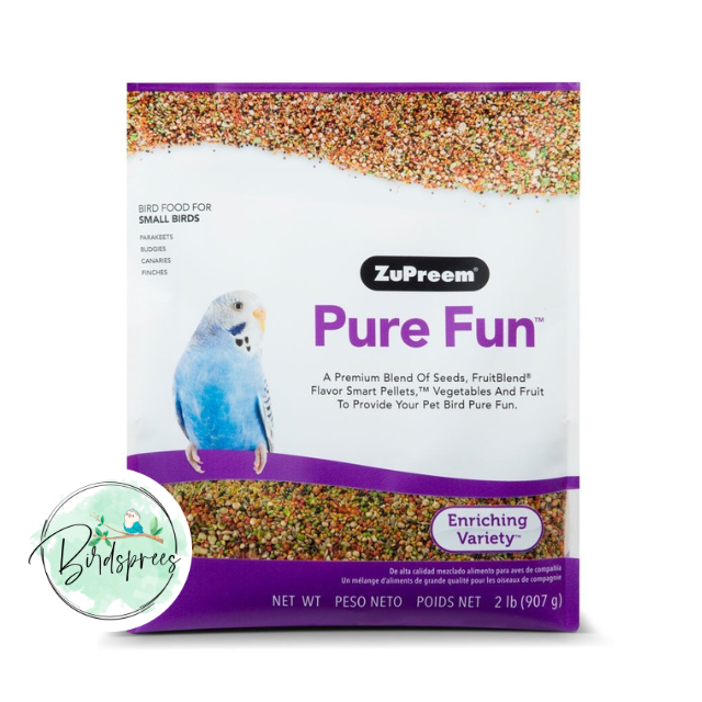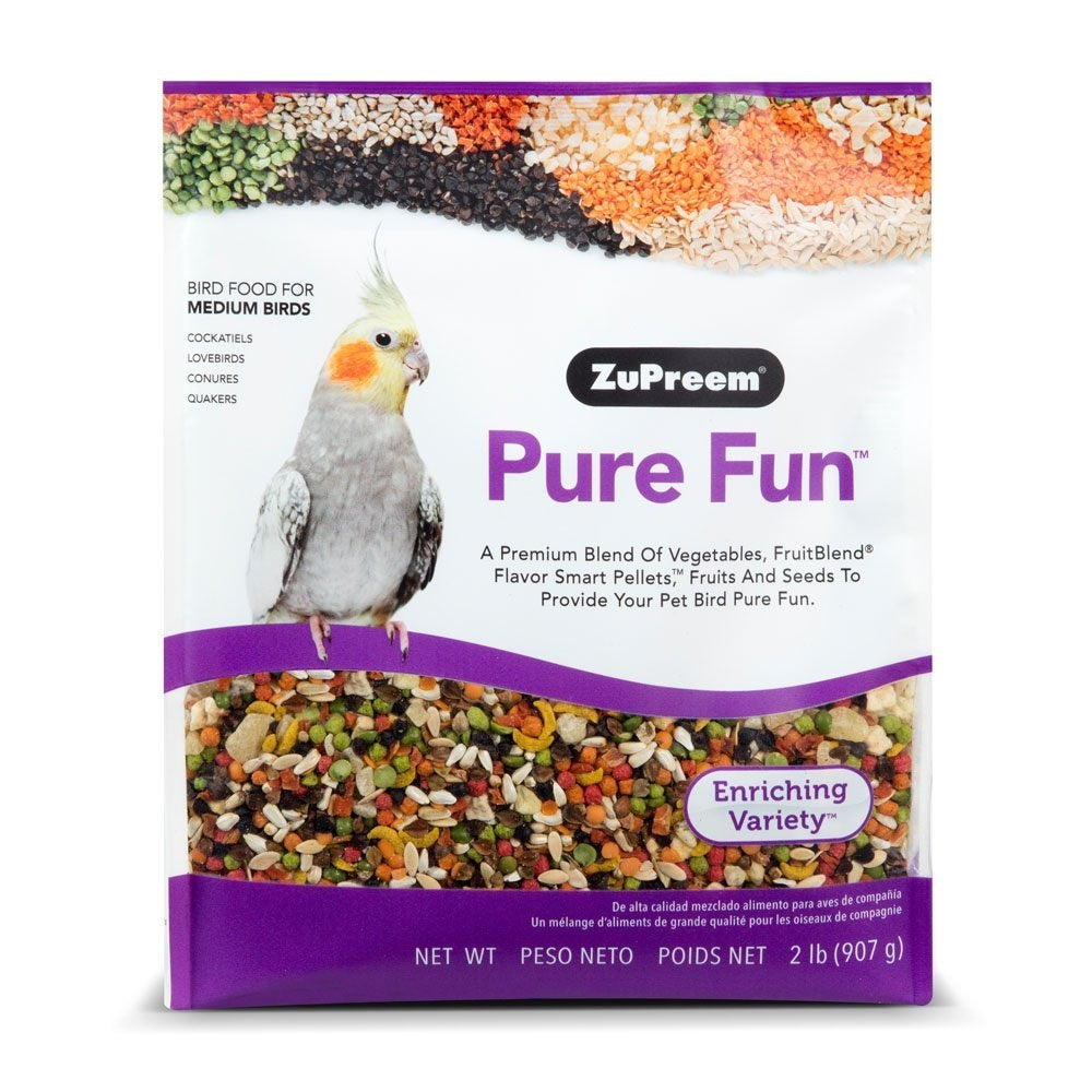 A premium blend of fruit, FruitBlend® Flavor Smart Pellets™ and vegetables to provide your pet bird pure fun. Pure Fun Bird Food for Small Birds is a premium blend of seeds, FruitBlend Flavor Smart Pellets, vegetables and fruit; Pure Fun‚ help to excite and enrich your pet bird. This blend includes a delicious mix of right-sized pieces for your bird which helps minimize wasted food.
